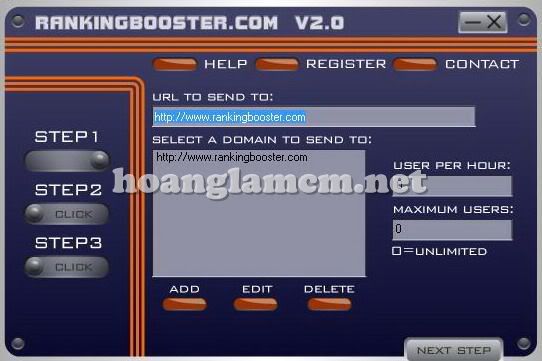 Sau khi cài đặt phần mềm, bạn mở RankingBooster. Lúc này chương trình đang ở bước 1, bạn nhập địa chỉ URL website của bạn vào ô URL TO SEND TO và ấn nút ADD để thêm vào danh sách trang web cần tăng thứ hạng. Bạn cũng có thể giới hạn số người truy cập vào website của bạn và số người truy cập tối đa trong một giờ bằng cách thay đổi giá trị trong 2 ô USER PER HOUR và MAXIMUM USERS. Bạn có thể giữ nguyên giá trị 0 nếu không giới hạn (Với những website có banwidth thấp thì nên giới hạn số người truy cập).